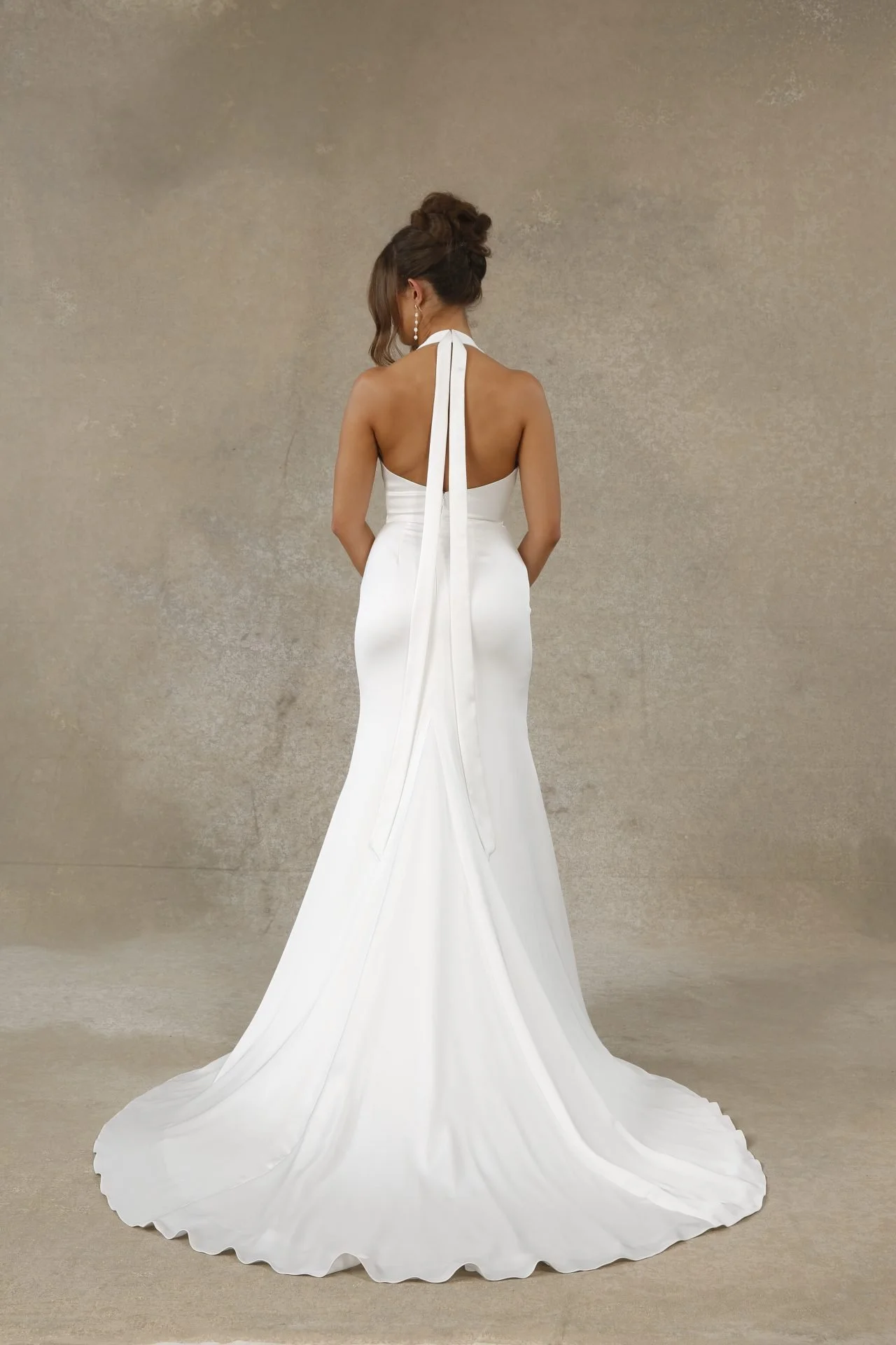 Silky, fitted halter gown with plunging V-neckline, featuring a wide waistband and neck scarf.