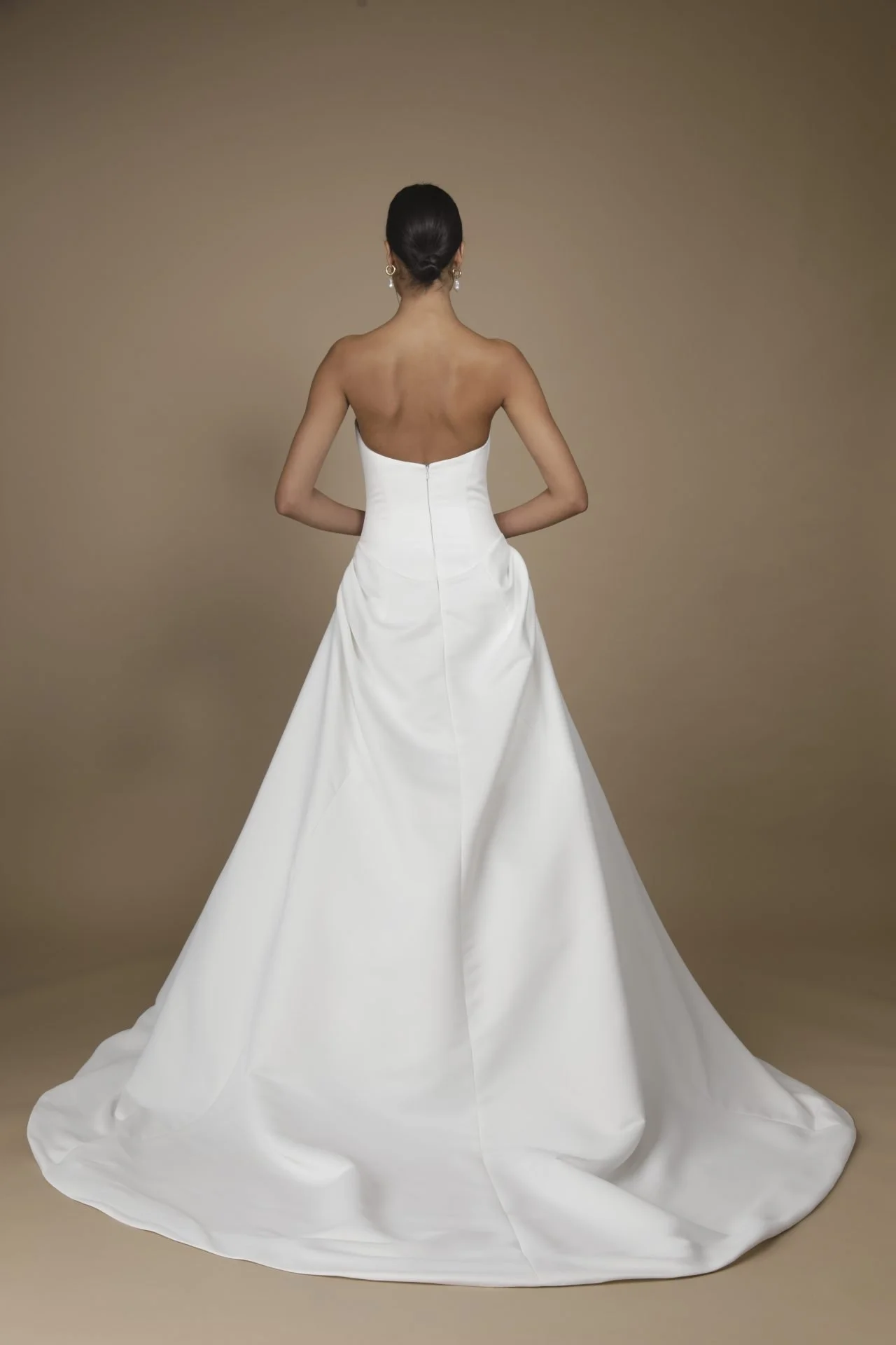 Matte satin drop waist a-line gown, featuring a curved neckline and ruched skirt with pickups.
