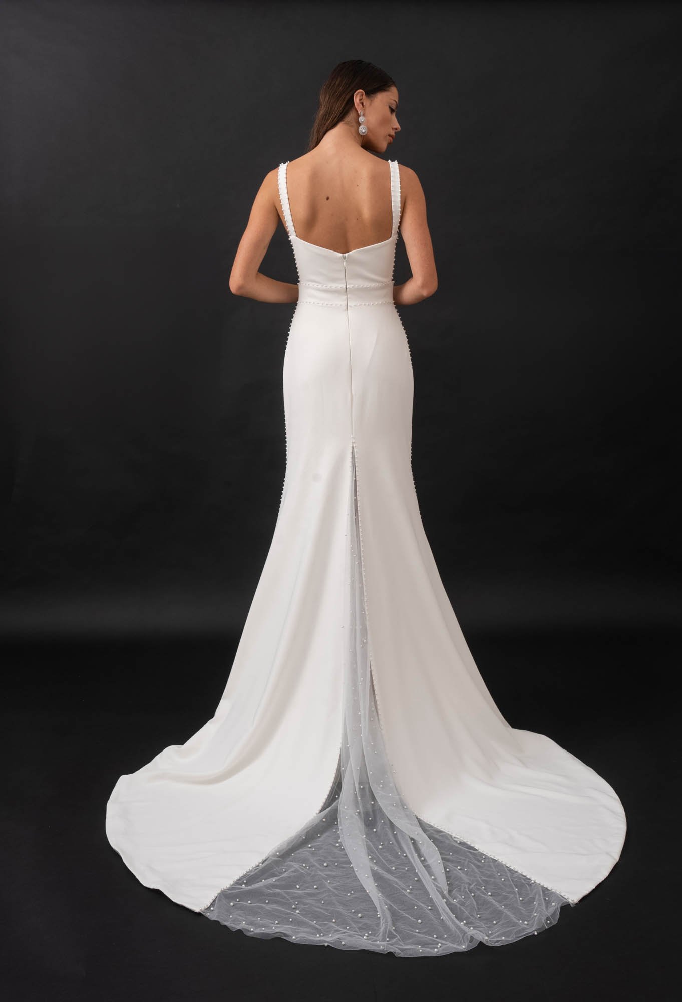 The simplicity of the square neckline is perfect to enhance a sentimental love locket. The back of the gown creates another ‘moment’ with a stylish pearl embellished tulle godet.